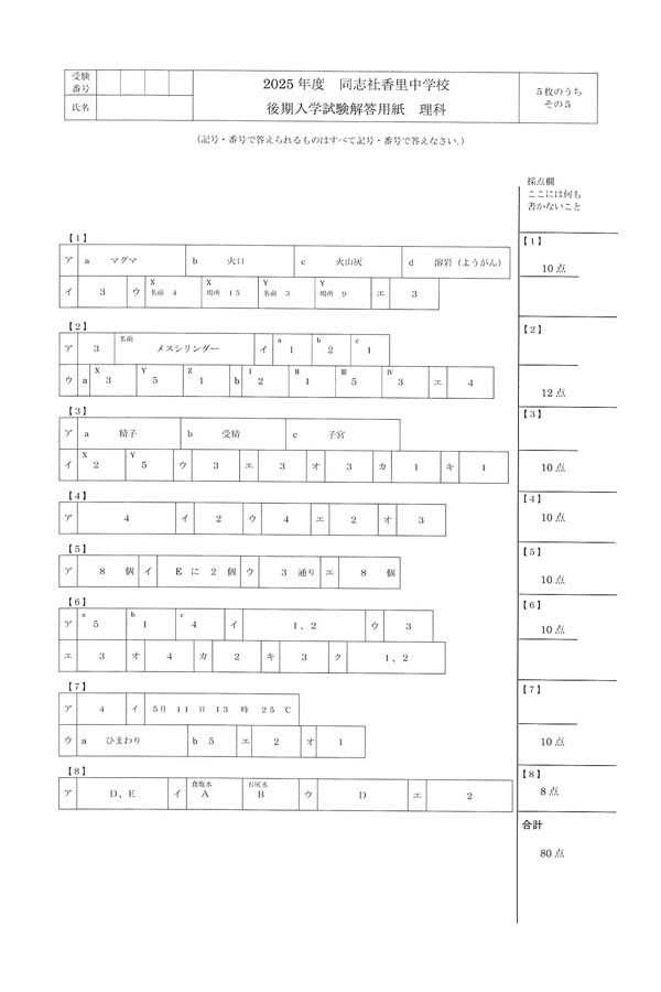 2025年度入試過去問題(後期)(理科 解答)(1ページ目)|同志社香里中学校の入試過去問