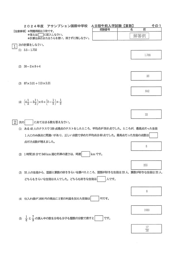 2024年度入試過去問題(算数 解答)(1ページ目)|アサンプション国際中学校の入試過去問