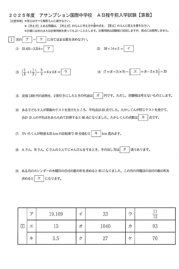 2025年度入試過去問題(A日程午前入試)(算数 解答)(1ページ目)|アサンプション国際中学校の入試過去問