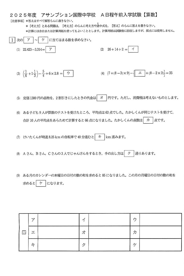 2025年度入試過去問題(A日程午前入試)(算数 問題)(1ページ目)|アサンプション国際中学校の入試過去問