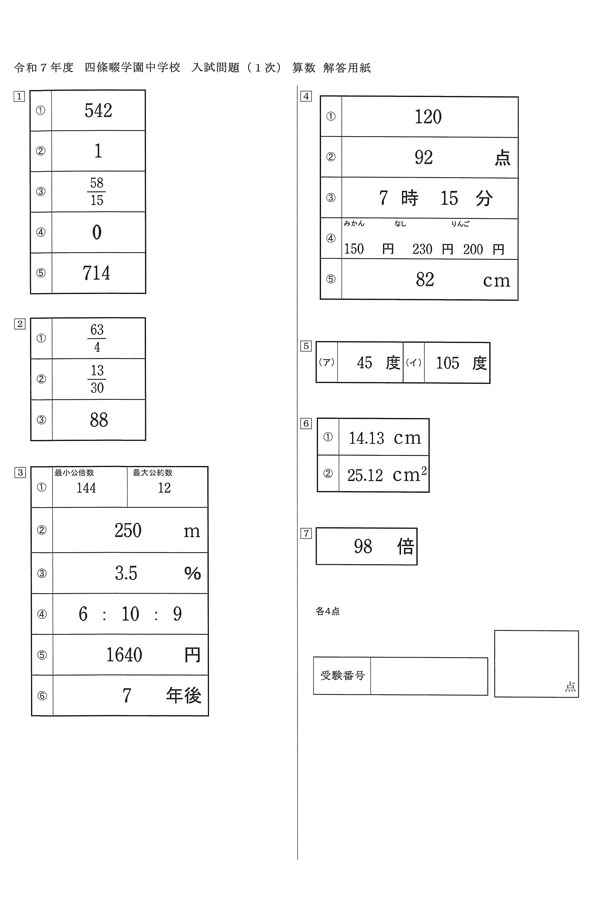 2025年度入試過去問題(1次)(算数 解答)(1ページ目)|四條畷学園中学校の入試過去問