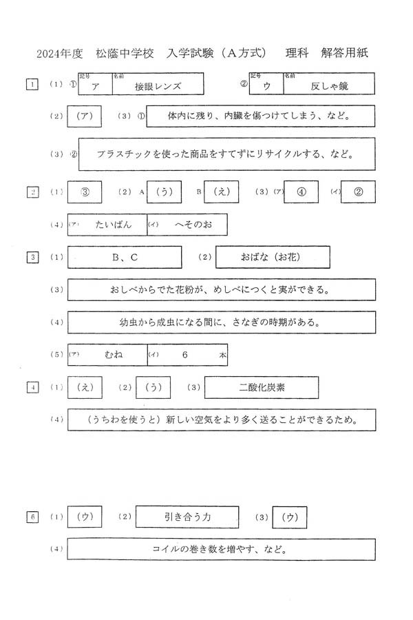 2024年度入試過去問題 A方式(理科 解答)(1ページ目)|松蔭中学校の入試過去問