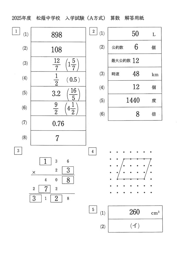2025年度入試過去問題(A方式)(算数 解答)(1ページ目)|松蔭中学校の入試過去問