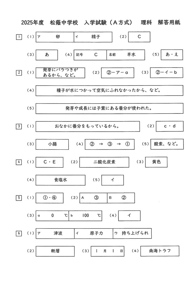 2025年度入試過去問題(A方式)(理科 解答)(1ページ目)|松蔭中学校の入試過去問