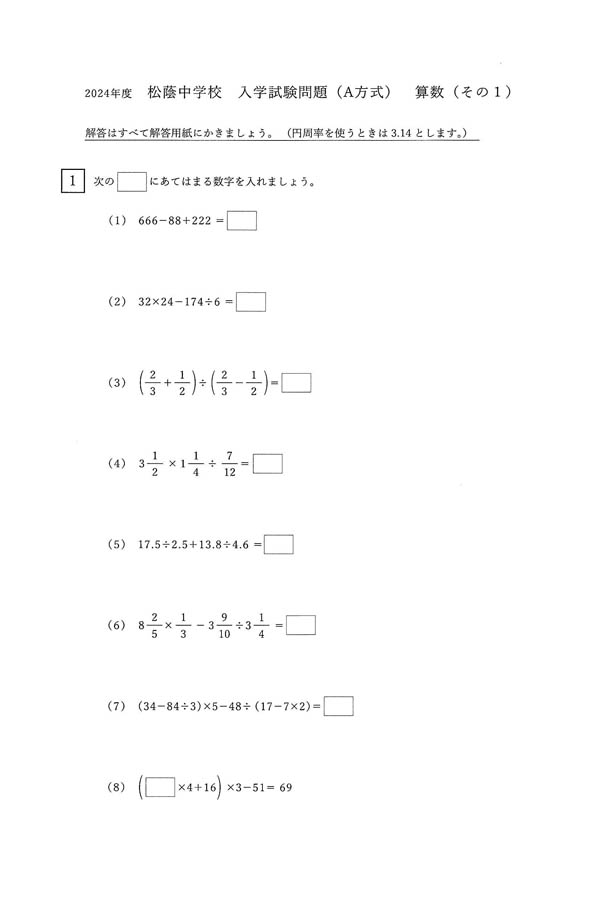 2024年度入試過去問題 A方式(算数 問題)(1ページ目)|松蔭中学校の入試過去問