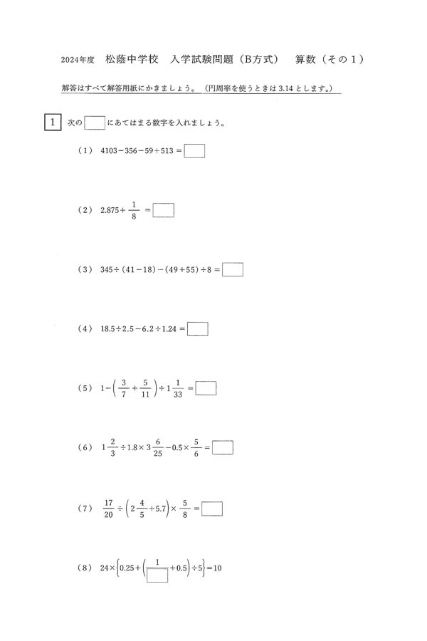 2024年度入試過去問題 B方式(算数 問題)(1ページ目)|松蔭中学校の入試過去問
