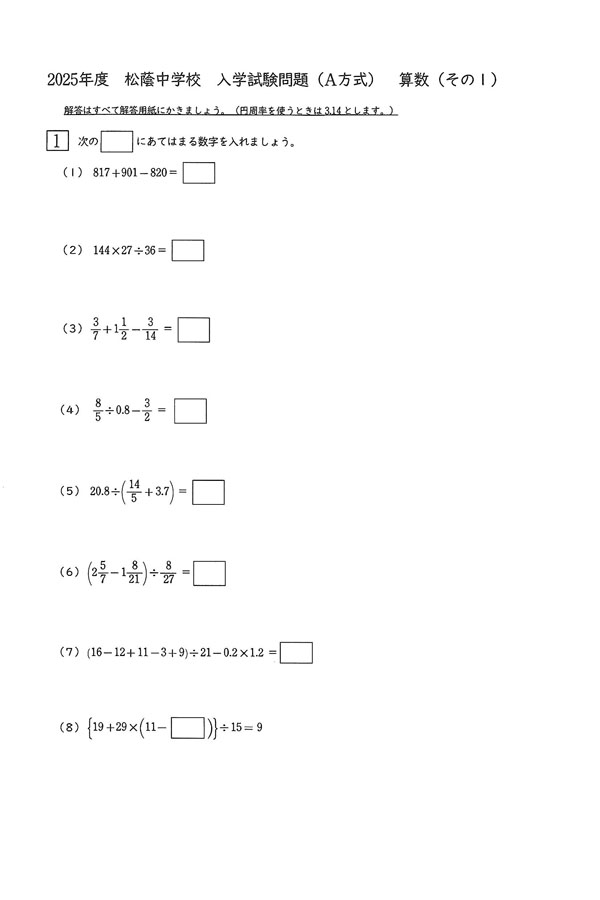 2025年度入試過去問題(A方式)(算数 問題)(1ページ目)|松蔭中学校の入試過去問