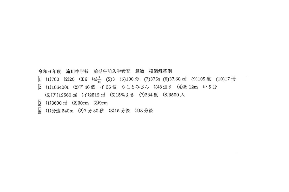 令和6年度入試過去問題 前期(午前)(算数 解答)(1ページ目)|滝川中学校の入試過去問
