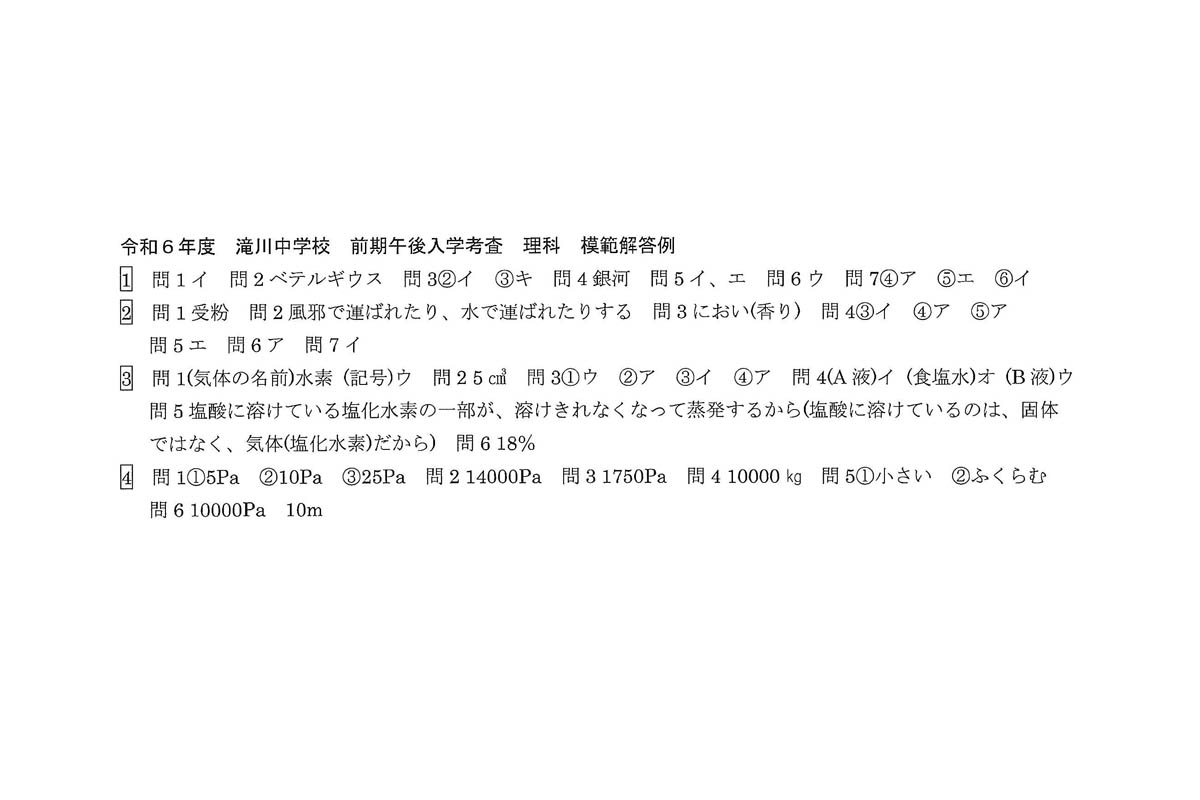 令和6年度入試過去問題 前期(午後)(理科 解答)(1ページ目)|滝川中学校の入試過去問