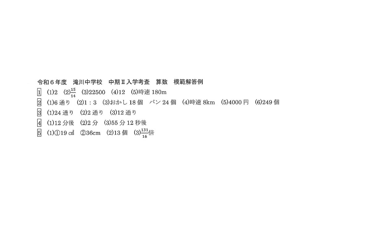 令和6年度入試過去問題 中期II(算数 解答)(1ページ目)|滝川中学校の入試過去問