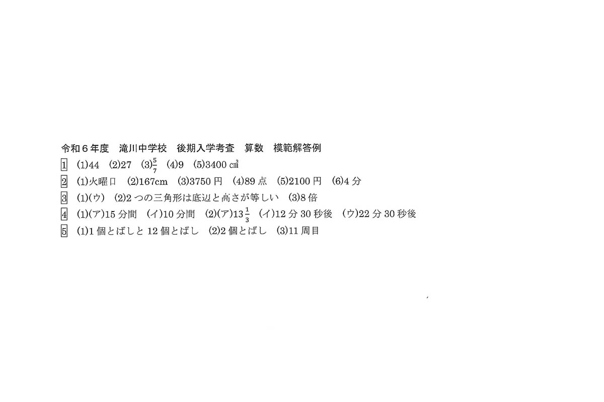 令和6年度入試過去問題 後期(算数 解答)(1ページ目)|滝川中学校の入試過去問
