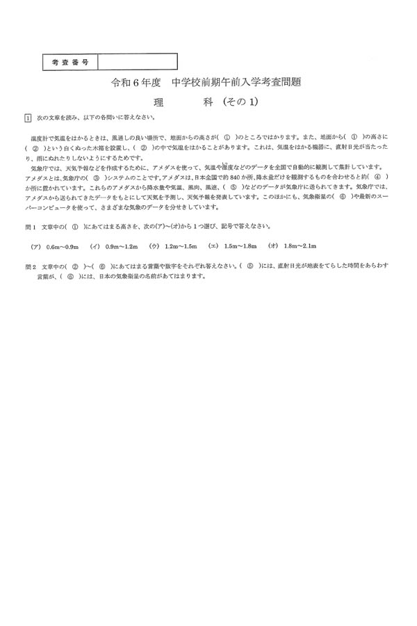 令和6年度入試過去問題 前期(午前)(理科 問題)(1ページ目)|滝川中学校の入試過去問