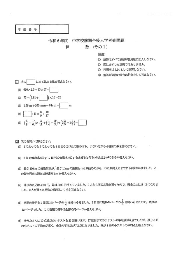 令和6年度入試過去問題 前期(午後)(算数 問題)(1ページ目)|滝川中学校の入試過去問