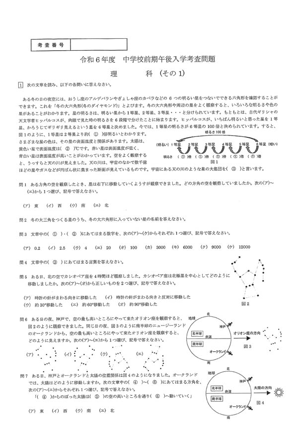 令和6年度入試過去問題 前期(午後)(理科 問題)(1ページ目)|滝川中学校の入試過去問
