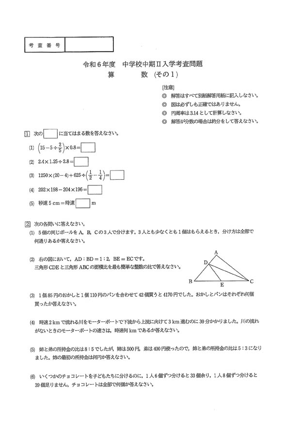 令和6年度入試過去問題 中期II(算数 問題)(1ページ目)|滝川中学校の入試過去問