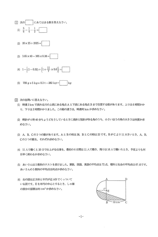 令和7年度入試過去問題 後期(算数 問題)(1ページ目)|滝川中学校の入試過去問