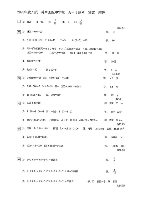 2025年度入試過去問題(A-I選考)(算数 解答)(1ページ目)|神戸国際中学校の入試過去問