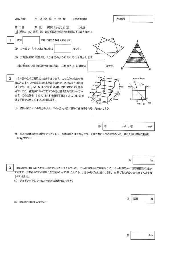 平成24年度入試過去問題 第二日(算数 問題)(1ページ目)|甲陽学院中学校の入試過去問