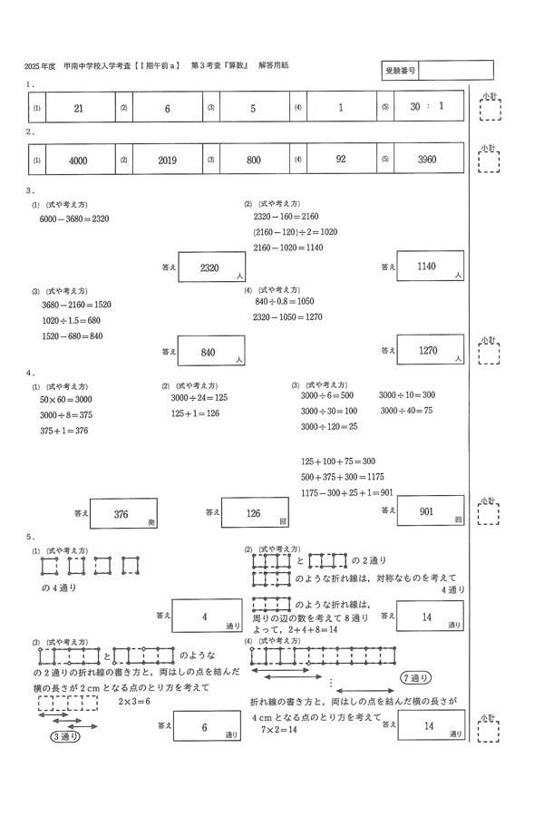 2025年度入試過去問題(I期午前a)(算数 解答)(1ページ目)|甲南中学校の入試過去問