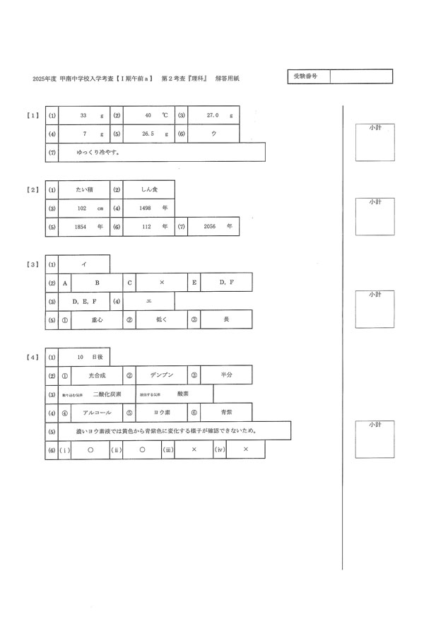 2025年度入試過去問題(I期午前a)(理科 解答)(1ページ目)|甲南中学校の入試過去問
