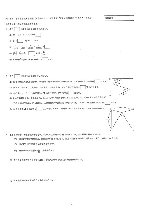 2024年度入試過去問題 I期午前a(算数 問題)(1ページ目)|甲南中学校の入試過去問