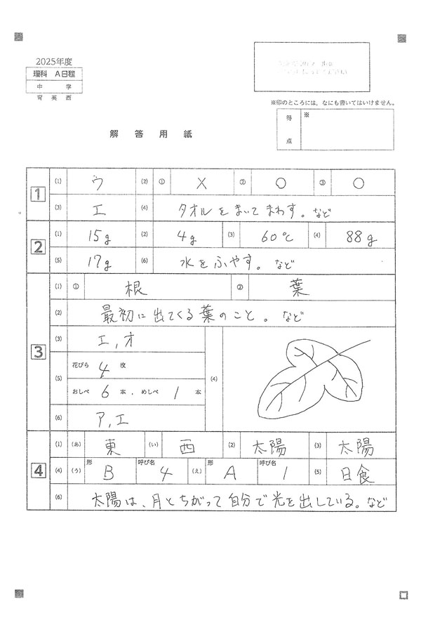 2025年度入試過去問題(A日程)(理科 解答)(1ページ目)|育英西中学校の入試過去問