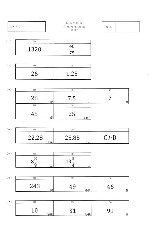 令和7年度入試過去問題(後期)(算数 解答)(1ページ目)|智辯学園和歌山中学校の入試過去問