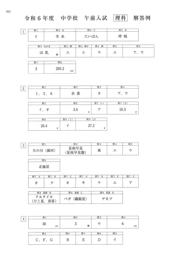 令和6年度入試過去問題 午前入試(理科 解答)(1ページ目)|近畿大学附属和歌山中学校の入試過去問