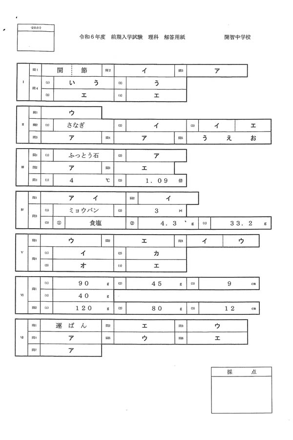 令和6年度入試過去問題 前期(理科 解答)(1ページ目)|開智中学校の入試過去問