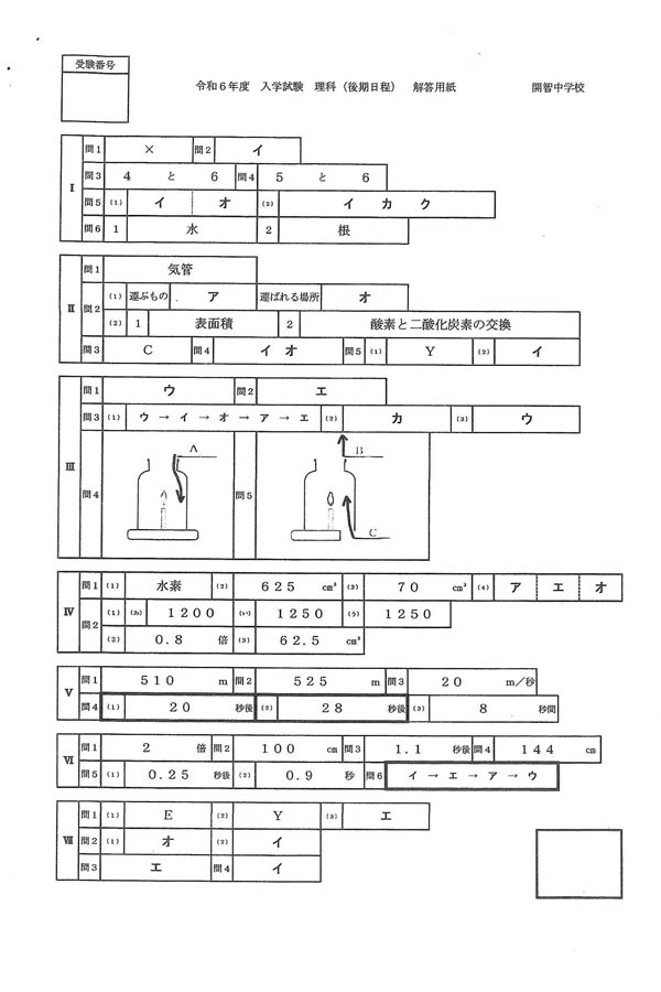 令和6年度入試過去問題 後期(理科 解答)(1ページ目)|開智中学校の入試過去問