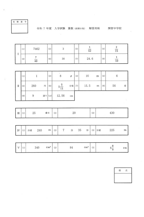 令和7年度入試過去問題(前期)(算数 解答)(1ページ目)|開智中学校の入試過去問