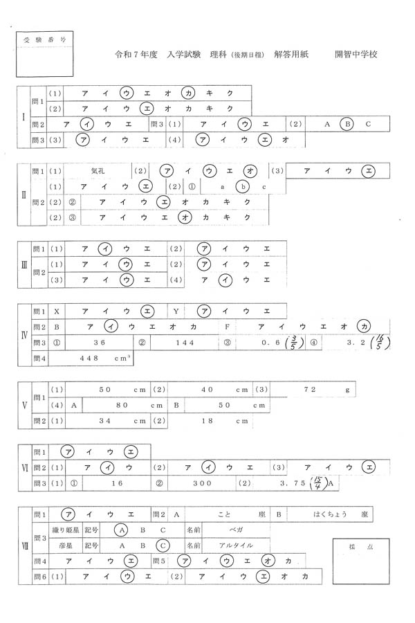 令和7年度入試過去問題(後期)(理科 解答)(1ページ目)|開智中学校の入試過去問
