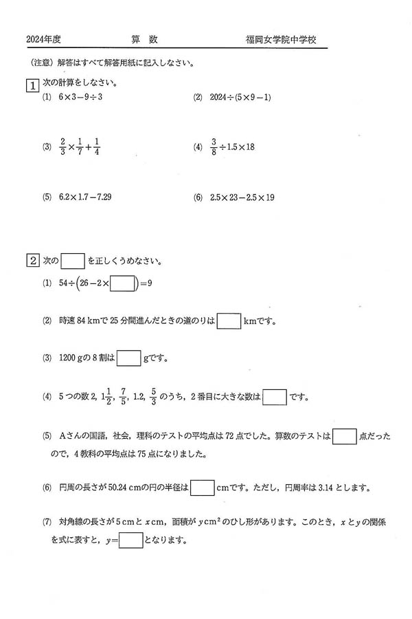 2024年度入試過去問題 1月入試(算数 問題)(1ページ目)|福岡女学院中学校の入試過去問
