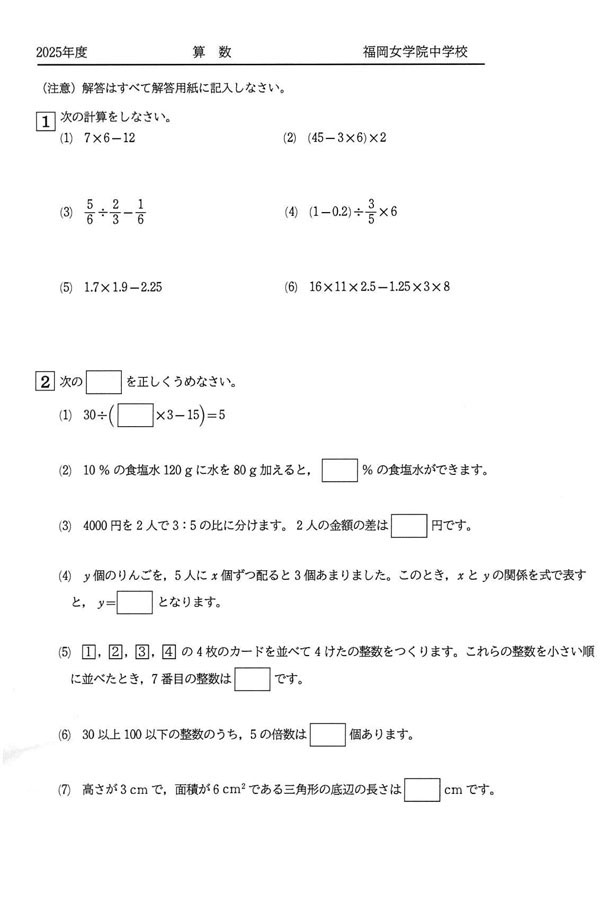 2025年度入試過去問題(算数 問題)(1ページ目)|福岡女学院中学校の入試過去問