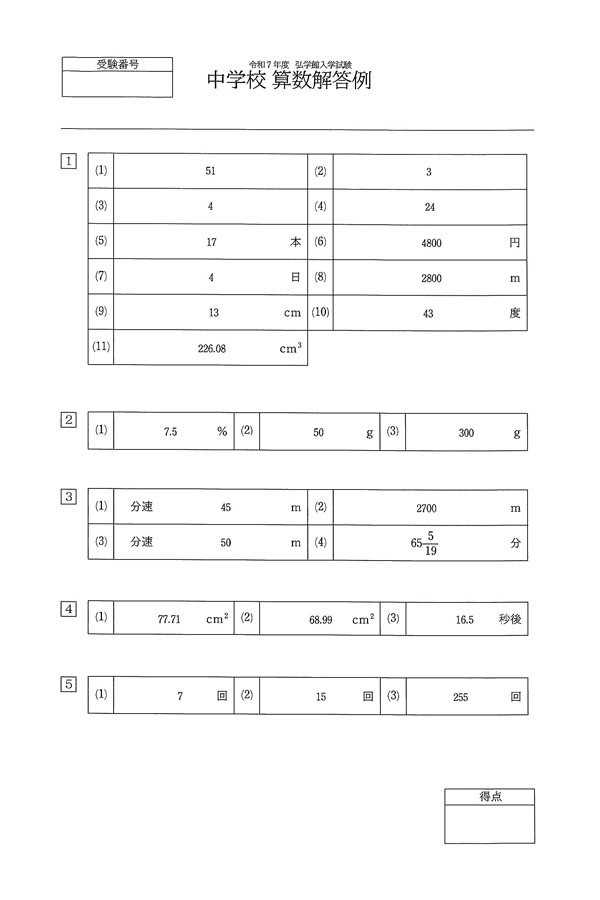 令和7年度入試過去問題(算数 解答)(1ページ目)|弘学館中学校の入試過去問