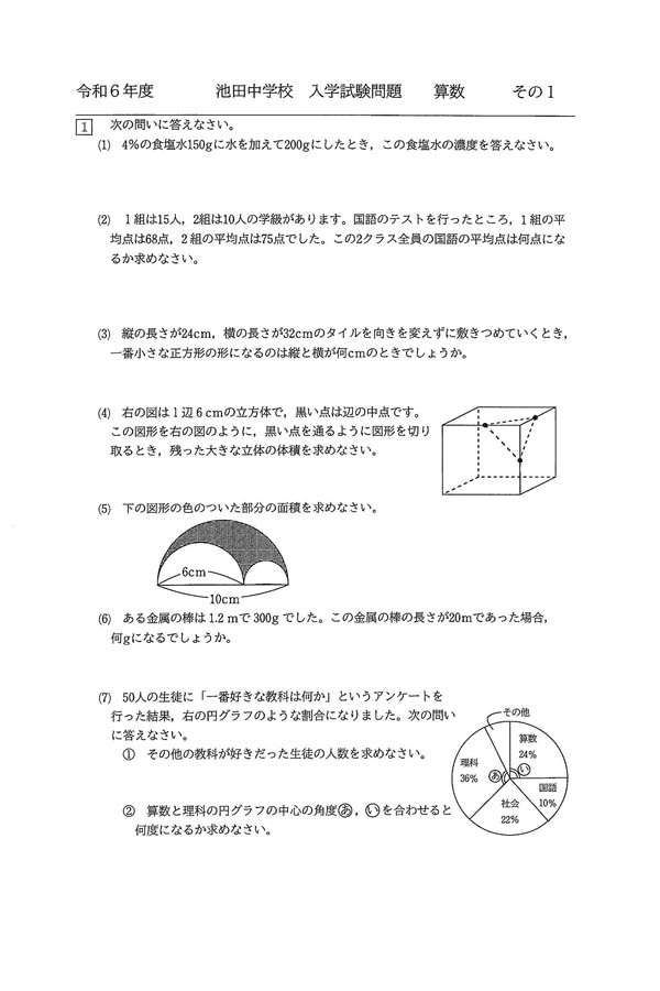 令和6年度入試過去問題(算数 問題)(1ページ目)|池田中学校の入試過去問