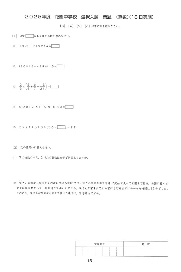 2025年度入試過去問題(選択入試)(算数 問題)(1ページ目)|花園中学校の入試過去問