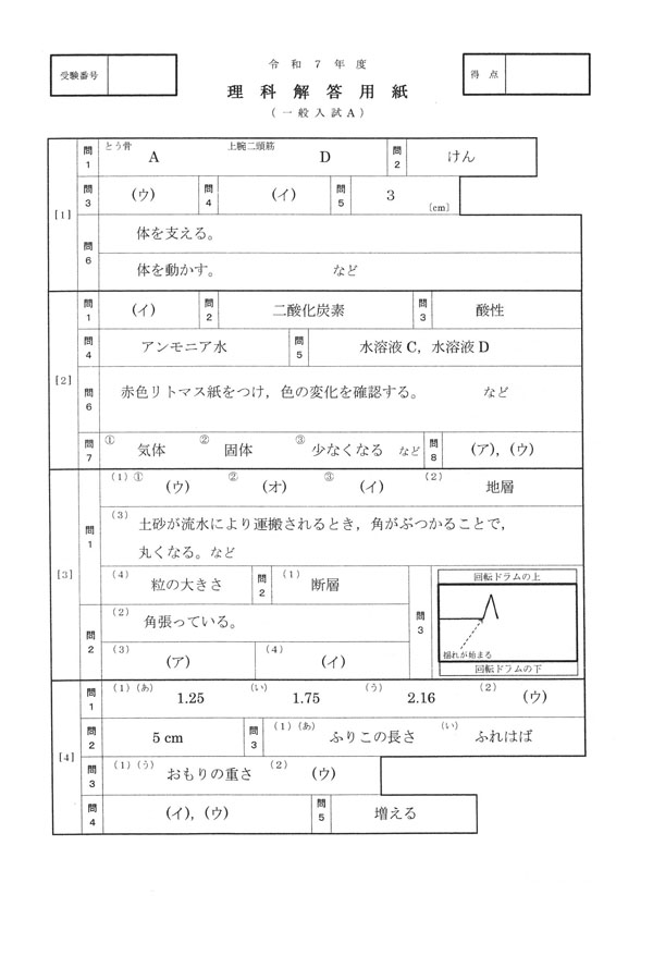 令和7年度入試過去問題(一般入試A)(理科 解答)(1ページ目)|智辯学園奈良カレッジ中学部の入試過去問