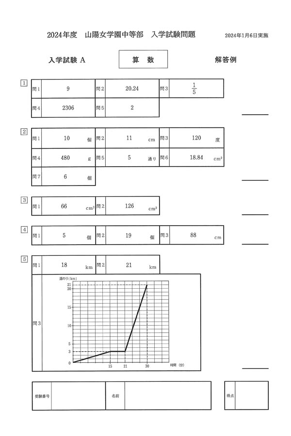 2024年度入試過去問題 A(算数 解答)(1ページ目)|山陽女学園中等部の入試過去問
