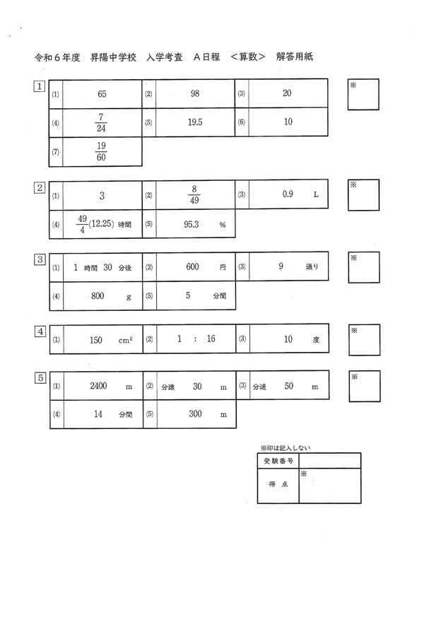 令和6年度入試過去問題(算数 解答)(1ページ目)|昇陽中学校の入試過去問