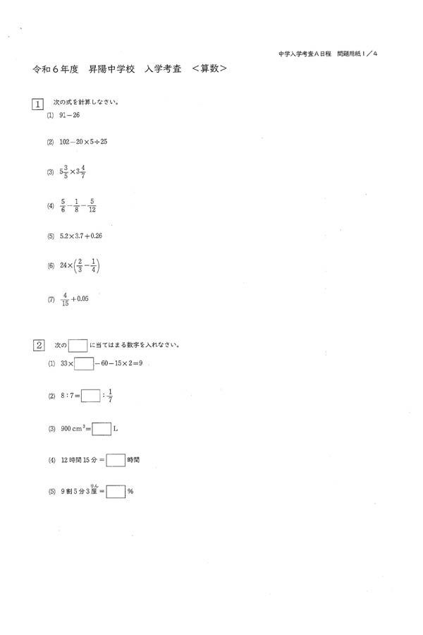 令和6年度入試過去問題(算数 問題)(1ページ目)|昇陽中学校の入試過去問