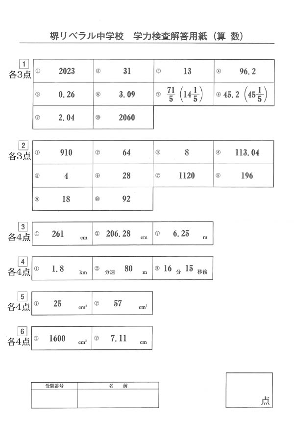 令和5年度入試過去問題(算数 解答)(1ページ目)|堺リベラル中学校の入試過去問