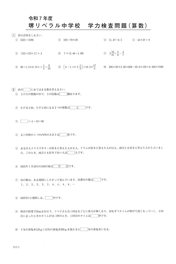 令和7年度入試過去問題(算数 問題)(1ページ目)|堺リベラル中学校の入試過去問