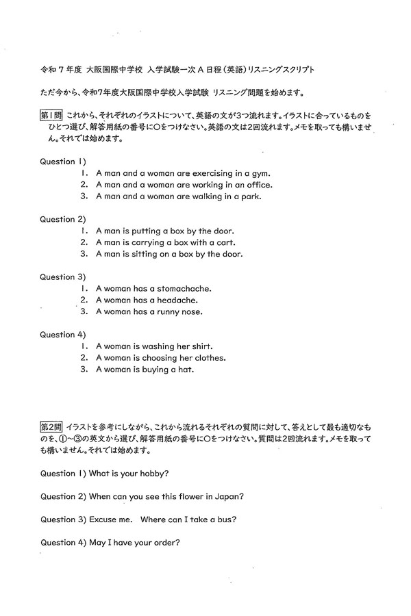 令和7年度入試過去問題(1次A)(英語 問題)(1ページ目)|大阪国際中学校の入試過去問