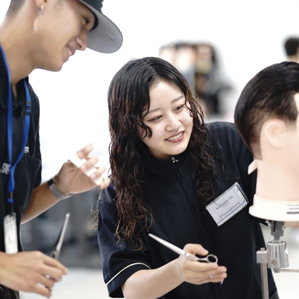 本学は美容科と理容科を併設しています。美容師・理容師免許(国家資格)取得を前提に、両科ともヘアカット、ヘアカラー、メイク、ネイル、エステ、ブライダル、アップヘア、着付などを全員が必修で勉強します。