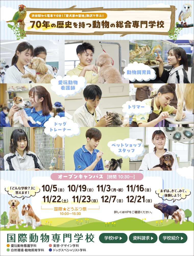 春キャン※高校1・2年生対象 要予約 参加無料 2026 3/28 土 13:00~ 16:30 参加する 3/29 日 13:00~ 16:30 参加する 開催内容 友達・保護者OK すべての学科がわかるスペシャルDay!新高校2・3年生の皆さん、スタートダッシュは春キャンで。本校の全学科体験や動物たちとのふれあいができるオープンキャンパスを開催。在校生との懇親会もあり、お花見気分で先輩たちとたくさんお話ができます。学校の雰囲気を感じられると大人気のオープンキャンパスです。<キャンパスツアーのおすすめポイント>(1)動物看護師・トリマー・動物飼育員・ドッグトレーナーのすべての体験ができる!(2)春休み中の先輩(在校生)と会話・質問ができる!*両日とも内容は同じです。 写真 場所はこちら 開催場所 国際動物専門学校 本館 住 所 〒154-0011 東京都世田谷区上馬4-3-2 地図を印刷 地図をスマホに送る 学校名 国際動物専門学校 住所 東京都世田谷区上馬4-3-2 電話 TEL.03-5430-4400 オープンキャンパス参加 友だちや家族とシェアしよう