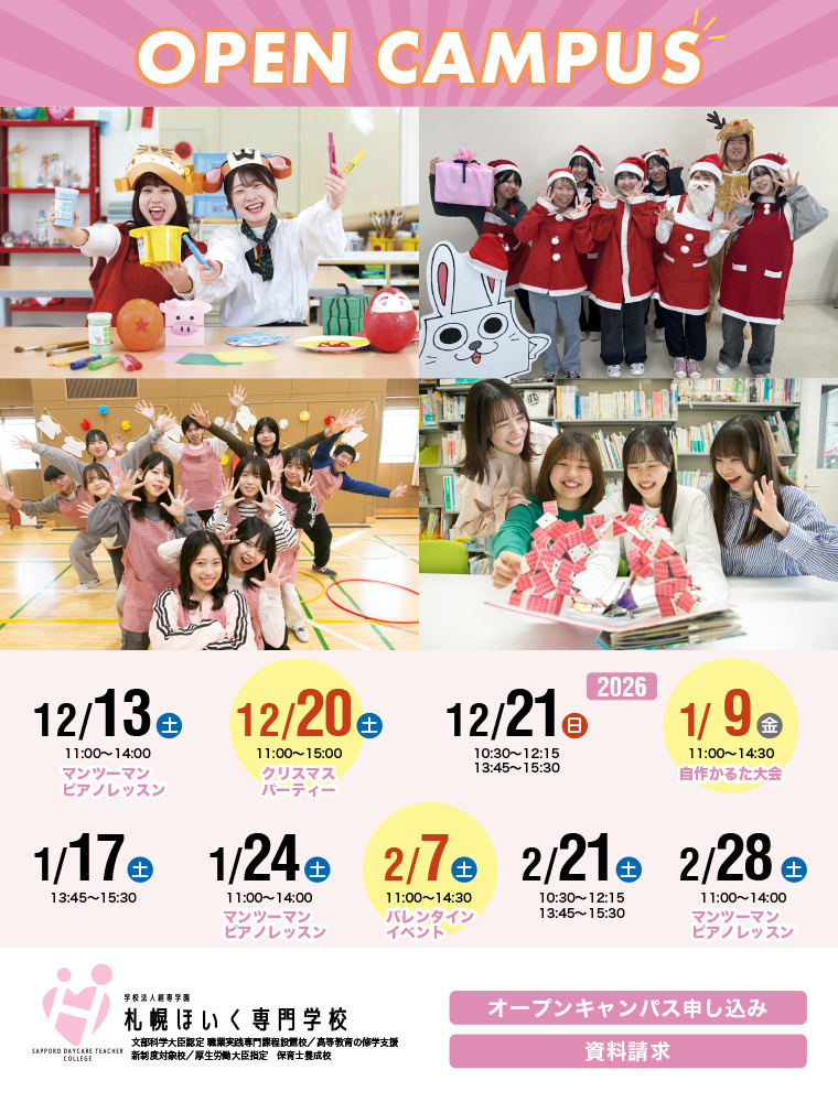 オープンキャンパス(ランチ付き) 要予約 参加無料 2025 12/13 土 11:00~ 14:00 参加する 12/20 土 11:00~ 15:00 参加する 2026 1/9 金 11:00~ 14:30 参加する 1/24 土 11:00~ 14:00 参加する 2/7 土 11:00~ 14:30 参加する 2/28 土 11:00~ 14:00 参加する 3/21 土 11:00~ 15:00 参加する 3/26 木 11:00~ 14:00 参加する 3/28 土 11:00~ 15:00 参加する もっと見る 開催内容 友達・保護者OK 奨学金制度の紹介 交通費補助 入学に有利 ランチ付き 個別相談可能 毎回、楽しい実技授業を体験できます。また、すてきな保育者に近づけるためのセミナーや個別相談の時間も用意しています!お一人でご参加の方もぜひ気軽にお越しください。男の子の参加も大歓迎!・模擬授業体験・ランチ付き・個別相談も可能です。・交通費補助あり(高校生限定)・宿泊費補助あり(高校生限定・除外日あり)・保護者説明会あり※詳細はお気軽にお問い合わせください。 写真 1日のタイムスケジュール例 センセイへの夢への第1歩!オープンキャンパスに遊びにおいでよ! 10:30~ 受付スタート 在校生がお出迎え!(スケジュールは11時開始時の一例です。) 11:00~ オープニング 今日のメニューを確認! 午前中の授業体験/ピアノマンツーマンレッスン 毎回違う楽しいメニュー!ピアノマンツーマンレッスンがある日も! お昼 在校生とランチ 学校のコト、生活のコトなんでも聞いてね!いろんなコトお話ししましょうね! 午後 えらべるセミナー 入学方法、学科、就職、資格のことをご説明。学科・コースの違いも詳しく説明します。 午後の授業体験 プロから学べる「動くあそび」や「製作あそび」が大人気!さっぽろほいくでは「あそび」を学ぶ授業があるんですよ。 午後の授業体験 プロから学べる「動くあそび」や「製作あそび」が大人気!さっぽろほいくでは「あそび」を学ぶ授業があるんですよ。 個別面談 さっぽろほいくの職員がみんなの不安や悩みを解決してくれるよ!気軽になんでも聞いてね! 個別面談 さっぽろほいくの職員がみんなの不安や悩みを解決してくれるよ!気軽になんでも聞いてね! オプションメニュー(女子寮見学/校舎見学) 気になることを確認!ご希望の方は、お知らせください! オプションメニュー(女子寮見学/校舎見学) 気になることを確認!ご希望の方は、お知らせください! 14:00 終了予定 また来てくださいね!※タイムテーブルの時間や内容等は変更になる場合もあります。 14:00 終了予定 また来てくださいね!※タイムテーブルの時間や内容等は変更になる場合もあります。 場所はこちら 開催場所 札幌ほいく専門学校 住 所 〒005-0004 北海道札幌市南区澄川4条4丁目1-1 地図を印刷 地図をスマホに送る 学校名 札幌ほいく専門学校 住所 北海道札幌市南区澄川4条4丁目1-1 電話 TEL.0120-616-553 オープンキャンパス参加 友だちや家族とシェアしよう