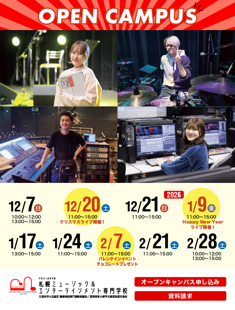 Zepp Sapporoで行われる定期公演や、本校の施設である最大300名収容の本格的ライブホール「Kiss Hall」でライブイベントを開催